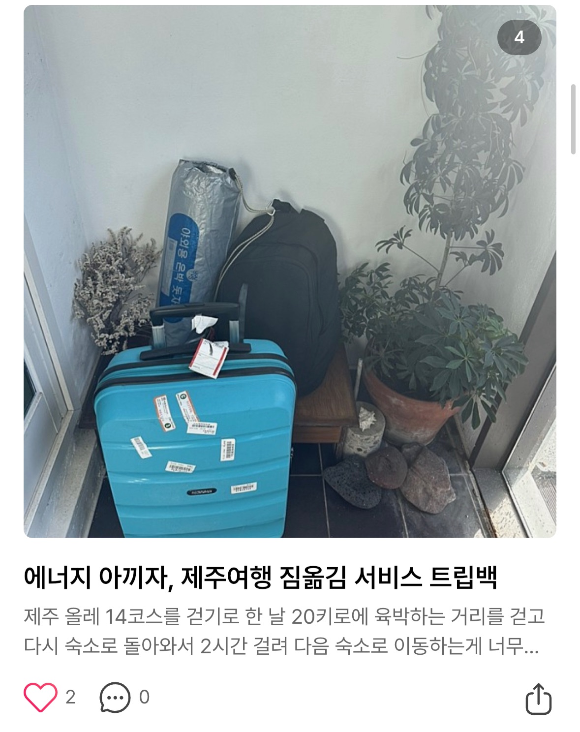 제주에 자주 오는데 짐옮김 서비스는 처음 이용해봐요! 이렇게 편리한게 있었다니 응대하시는 매니저님도 친절하시고 덕분에 가벼운 여행할 수 있었어요!